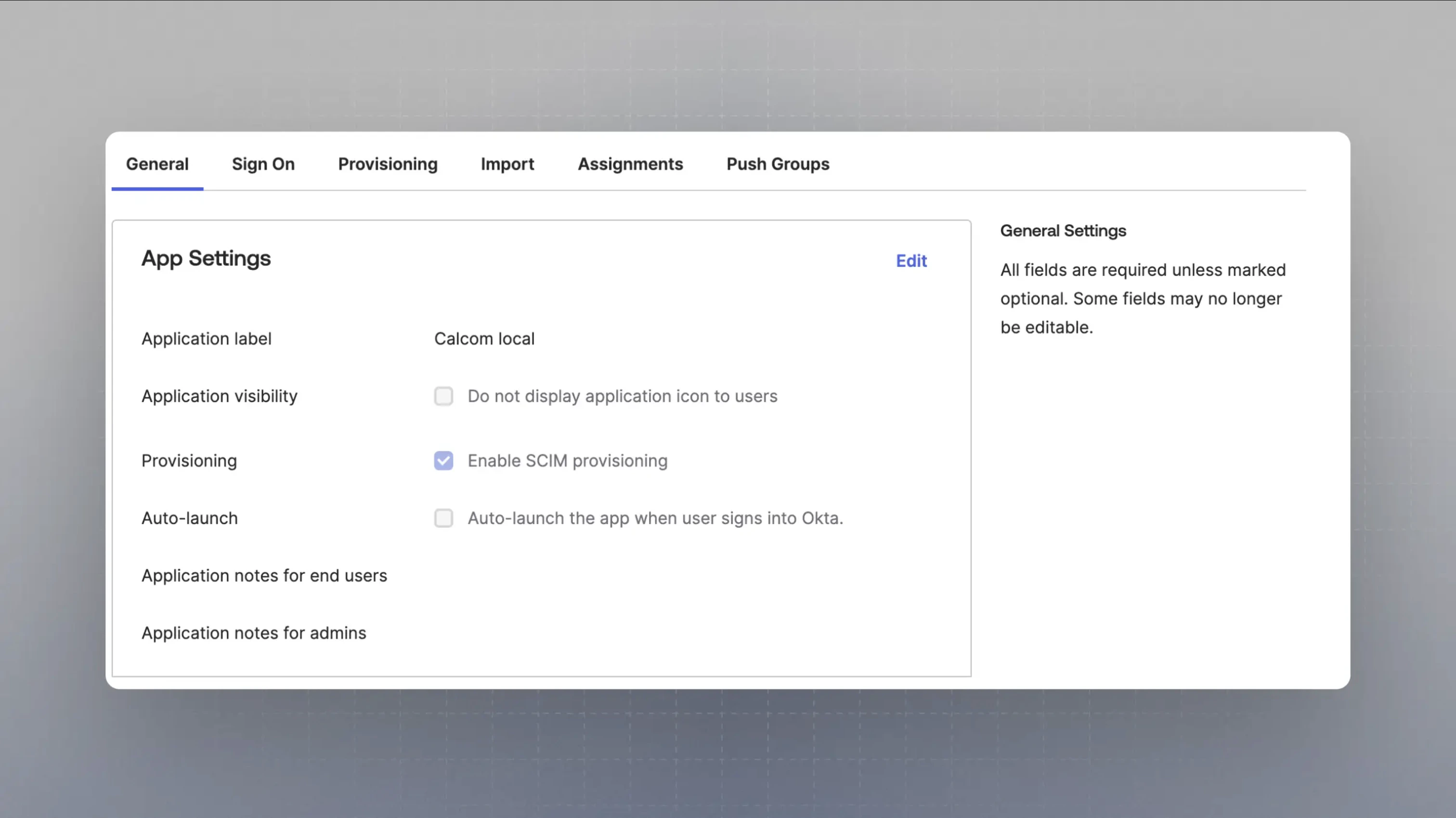 6. Once the application is created, under General -> App Settings, click “Edit” and click the checkbox “Enable SCIM provisioning ”